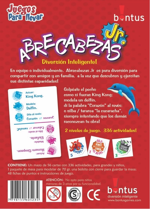 ¡Un desafío lleno de imaginación, creatividad y risas! Abrecabezas Jr propone actividades divertidas y disparatadas que invitan a moverse, actuar, modelar, tararear y mucho más… todo con el objetivo de que los demás adivinen qué estás haciendo. Desde golpearte el pecho como King Kong, modelar un delfín con masa, decir palabras al revés o silbar canciones populares, ¡cada desafío pone a prueba la creatividad y el ingenio de los jugadores! Con dos niveles de dificultad, es ideal para chicos y grandes, perfecto para cumpleaños, tardes en casa, clases o vacaciones.