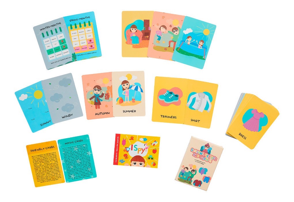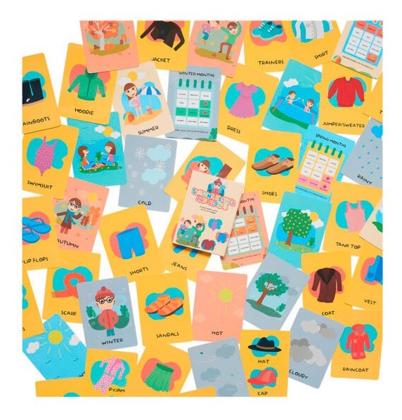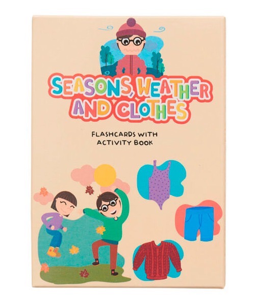 Juego de cartas educativas en inglés para aprender vocabulario sobre estaciones, clima y ropa. Estimula el lenguaje, la percepción y el aprendizaje lúdico desde edades tempranas.