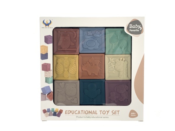 Set de 9 cubos encastrables de silicona, ideales para estimular el desarrollo sensorial, motor y cognitivo a través del juego.